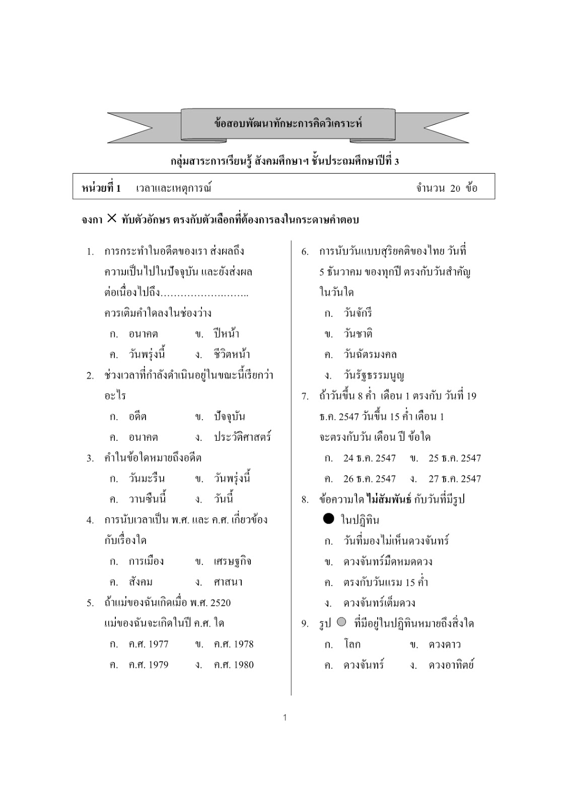 ข้อสอบมาตรฐานชั้น ป.3 - วิชาสังคมศึกษา - หน่วยที่ 1 เวลาและเหตุการณ์